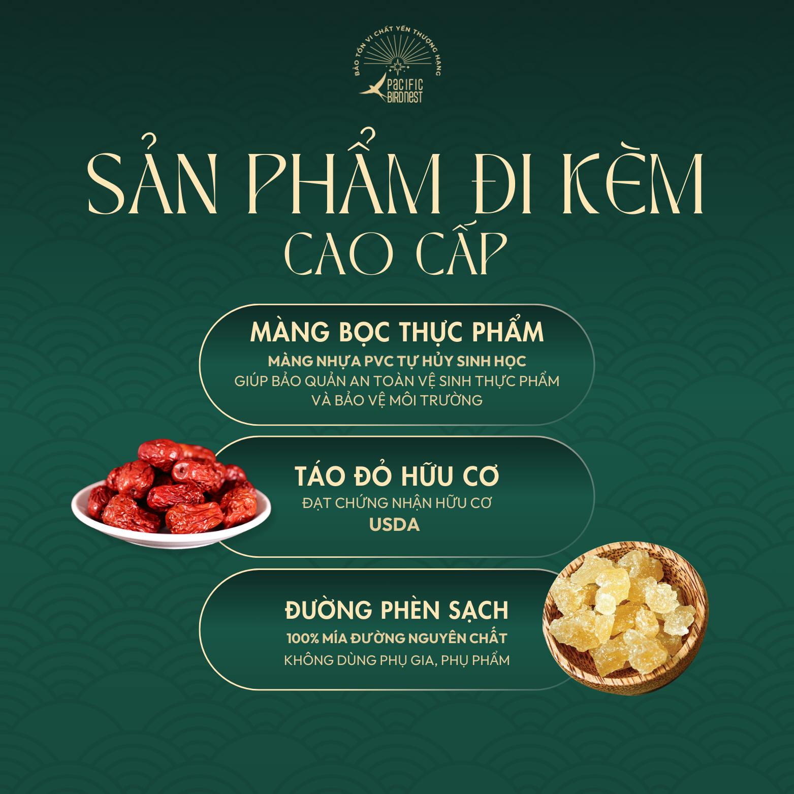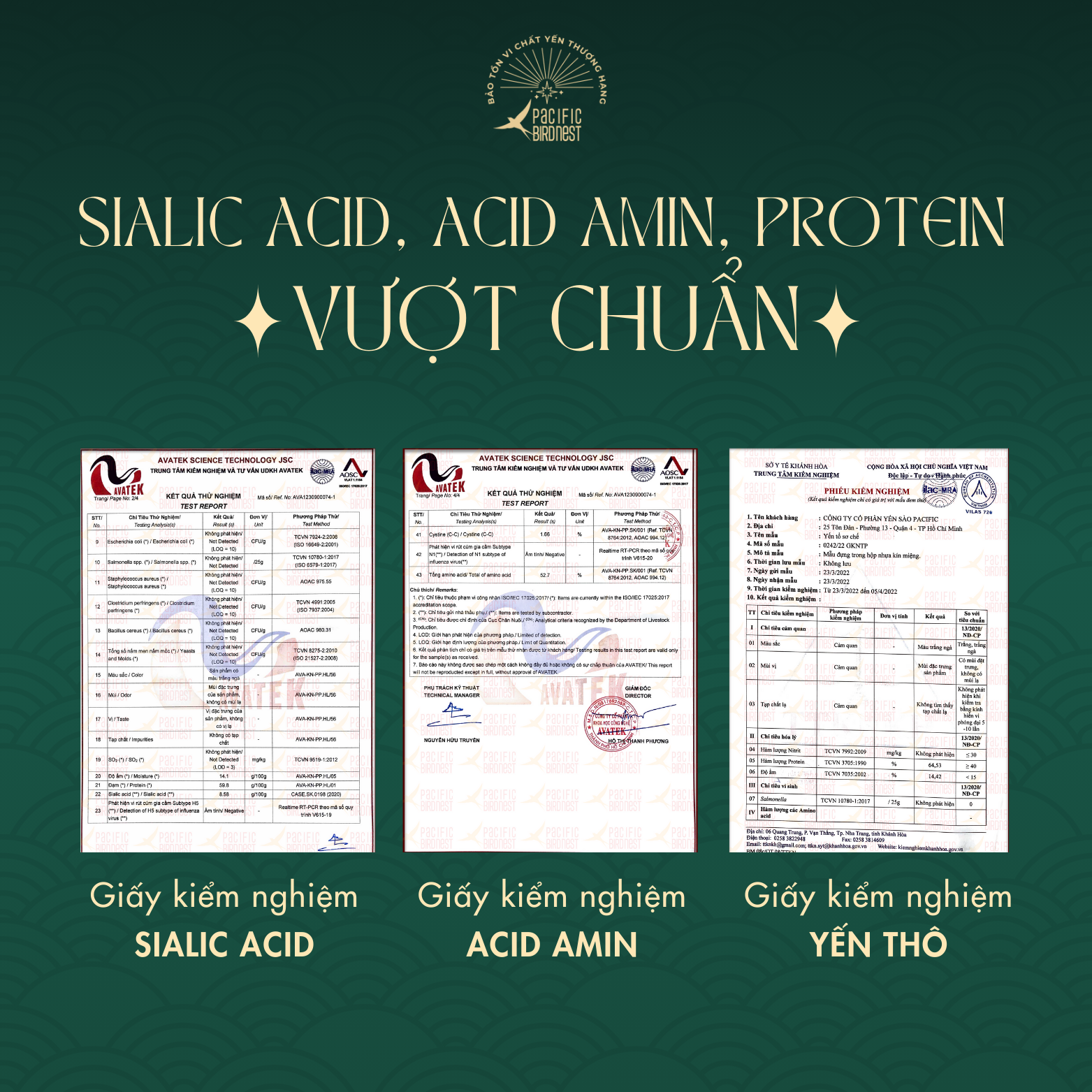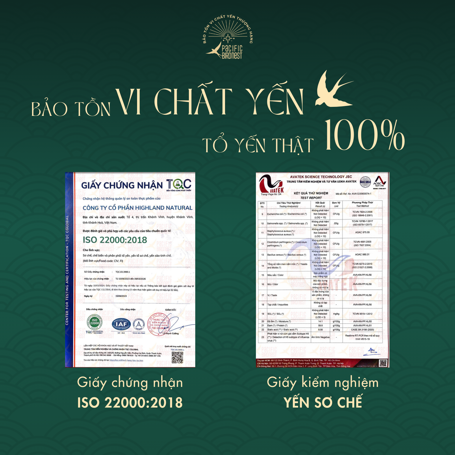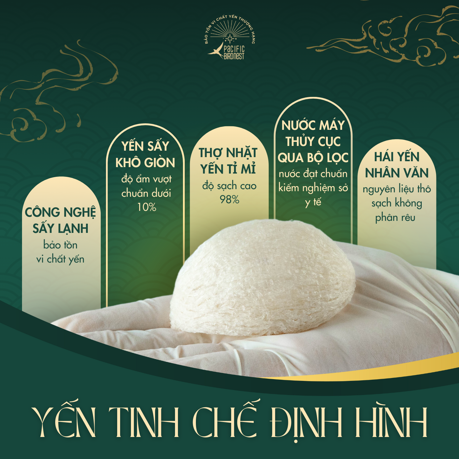 Lựa chọn nguyên liệu thô đầu vào sạch, không phân rêu, trực tiếp từ nhà yến lâu năm. Sau khi được sơ chế bằng phương pháp nhặt ướt, dưới dòng nước chảy liên tục, đảm bảo độ sạch lên đến 99% và bảo tồn vi chất yến tốt nhất. Yến sẽ được đóng định hình chuẩn dáng và được sấy lạnh đến độ ẩm vượt chuẩn. Yến thành phẩm đạt tỉ lệ 2,5:1. Kiểm nghiệm chỉ tiêu chất dinh dưỡng trong yến tinh chế Pacific Bird Nest vượt chuẩn Nghị định của Chính phủ.