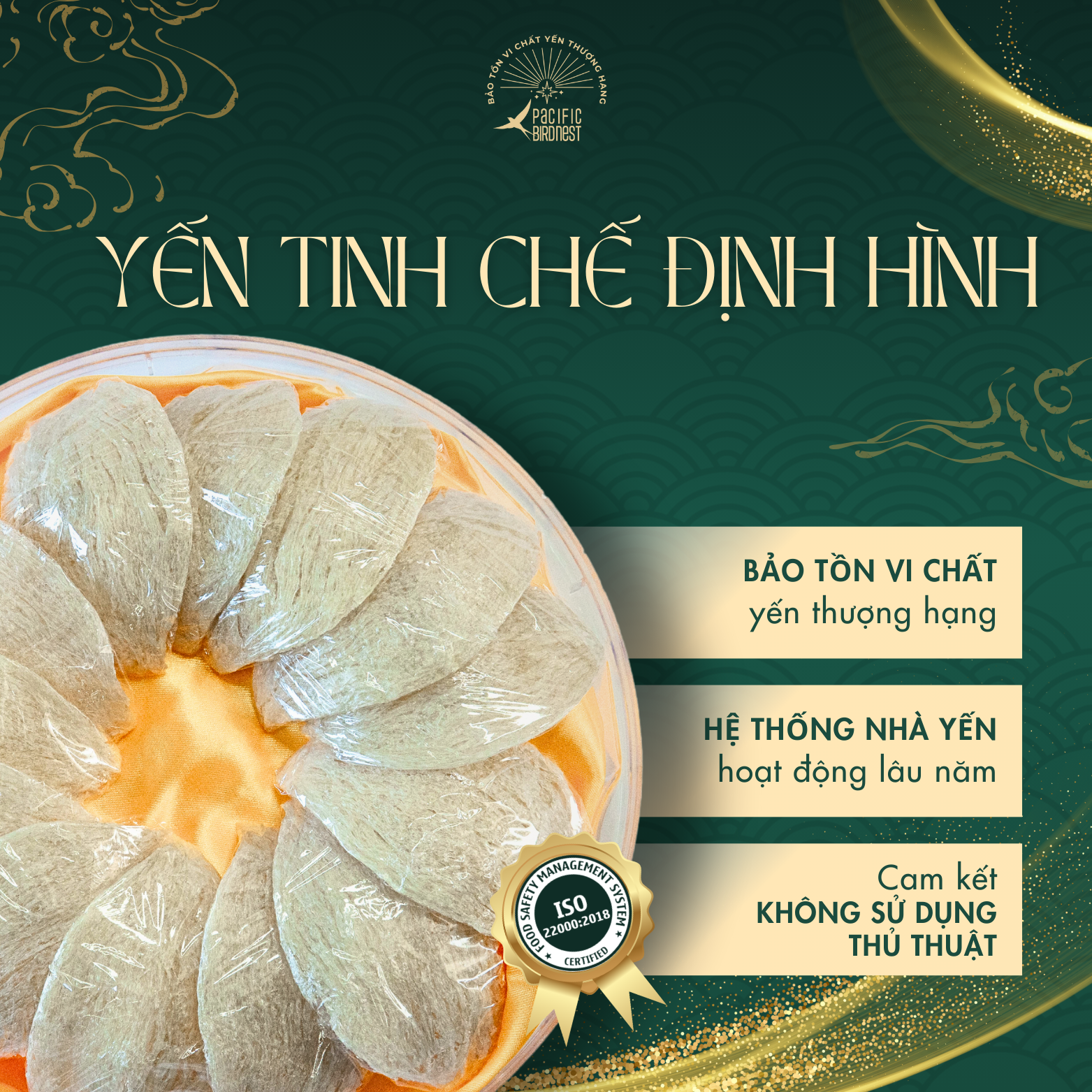 Selected clean raw materials, without droppings or moss, sourced directly from a long-standing birdhouse. After being cleaned using the wet-picking method under a continuous flow of water, the nests achieve up to 99% cleanliness and optimal preservation of their micro-nutrients. The nests are then shaped to standard form and cold-dried to a moisture level that exceeds standards. The finished nests achieve a 2.5:1 ratio. Nutritional content testing of the refined Pacific Bird Nest surpasses government decree standards.